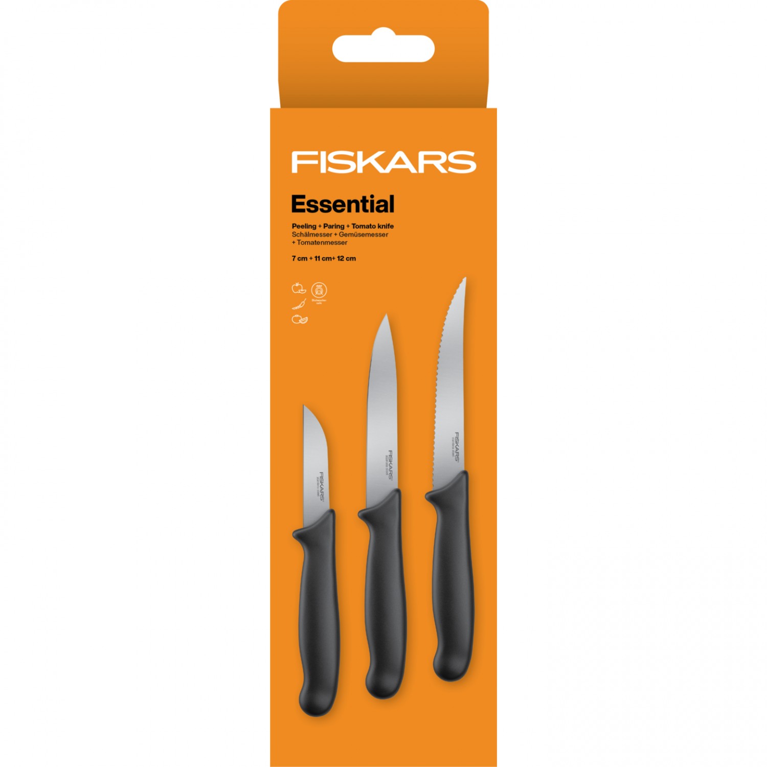 Набір кухонних ножів Fiskars Essential 3 шт (1065584) це - базовий комплект із трьох ножів для щоденної роботи на кухні: ніж для чищення 7 см, універсальний ніж 11 см та томатний ніж 12 см із серейторним лезом — для швидкої підготовки овочів, фруктів і продуктів зі шкіркою.